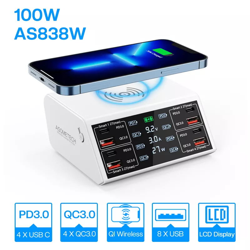 Say goodbye to messy cables and slow charging. This 100W multi-port fast charging station is built to power your entire tech lineup at once. With 8 high-speed USB ports and a wireless charging pad on top, it becomes the only charging solution you need on your desk, nightstand, or travel setup.