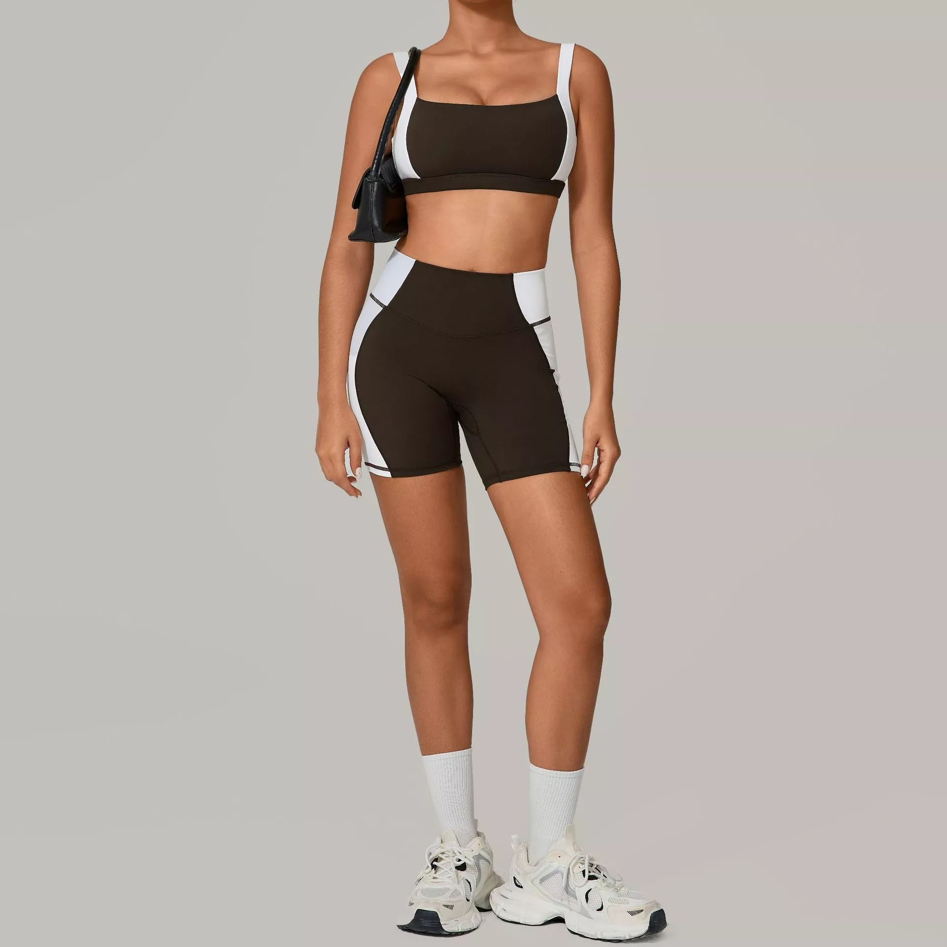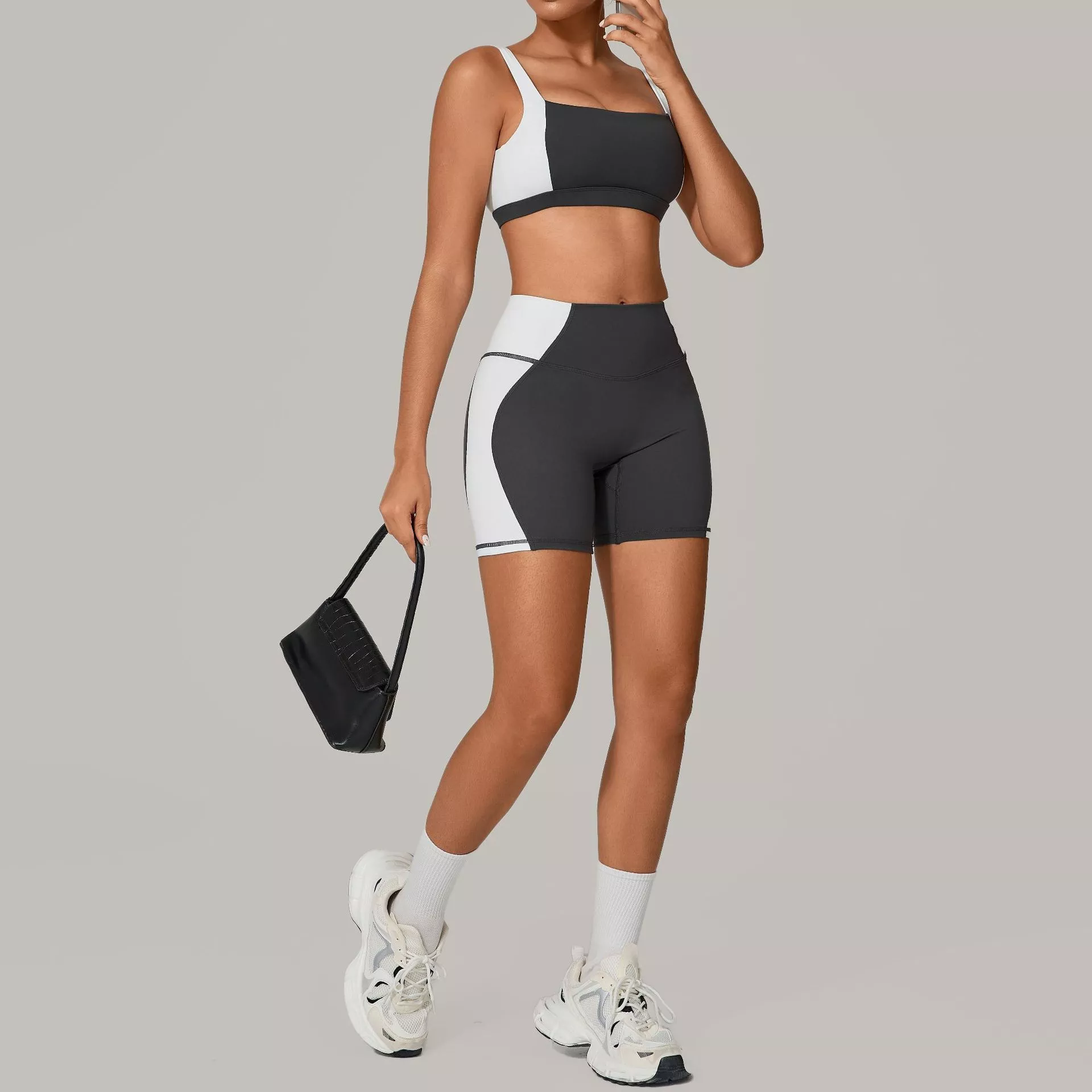 2PCS Color Block Yoga Set with Sports Bra and High Waist Workout Shorts