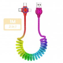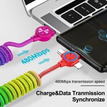 Our cable boasts a trio of connectors – Micro USB, Type-C, and Lightning – ensuring compatibility with a wide range of devices. The 1M spring cable is engineered to extend and retract smoothly, offering a tangle-free experience and the convenience of adjustability. With a maximum current of 3A, this robust cable promises rapid charging, getting your devices back in action quicker than ever.