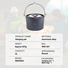 Embark on your outdoor adventures with our 4L Outdoor Camping Hanging Pot, the ultimate cookware for camping, fishing, and picnics. Designed for convenience and efficiency, this pot caters to the culinary needs of 4-6 people, making it a must-have for group outings. Its versatility allows direct heating on fire, perfect for creating memorable outdoor dining experiences.