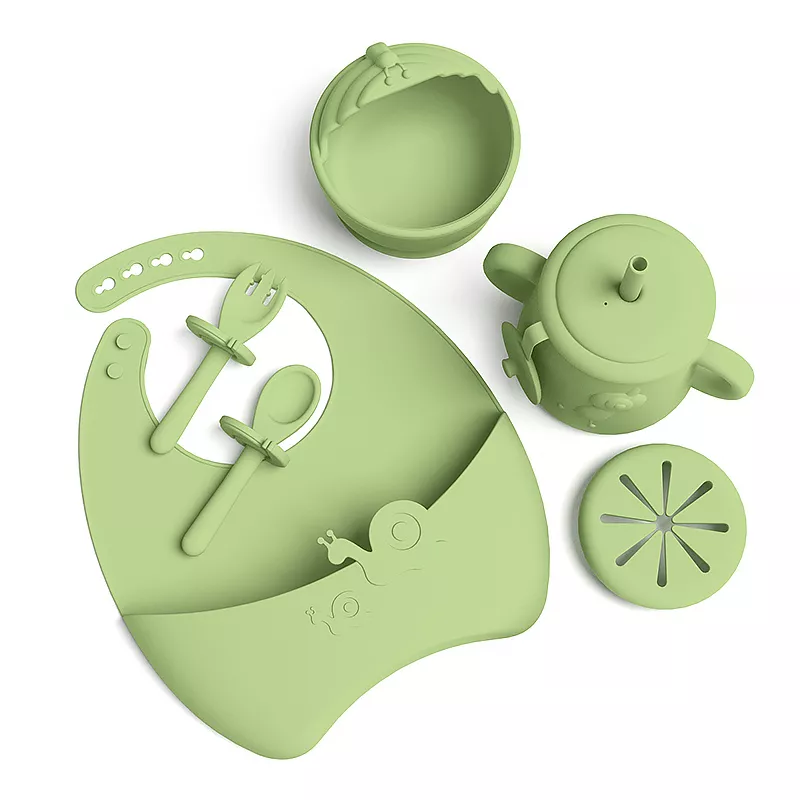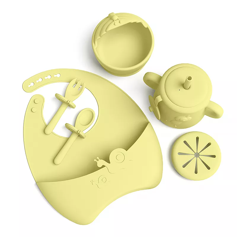 5-Piece Silicone Baby Tableware Set with Suction Bowl, Spoon, Fork, Cup & Adjustable Bib