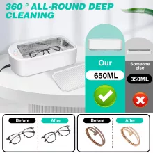 What makes this ultrasonic cleaner special? It’s designed to clean multiple items at once, thanks to its generous 650ML capacity, while keeping them safe from scratches or damage. With just a touch of a button, you can effortlessly switch between quick cleaning (within 5 minutes) or intensive cleaning (within 10 minutes) based on your needs. It’s easy to use, with a simple interface and a noise-reducing, durable build that’s built to last.