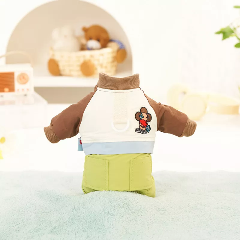 This outfit combines the best features of a warm coat and a playful jumpsuit. With a stylish color-blocked design, it gives your pet a trendy look while offering real functional benefits. The soft interior helps retain heat, making it ideal for autumn breezes and winter chills. Whether your pup is lounging, sleeping, or exploring, this jumpsuit keeps them comfortable in every moment.