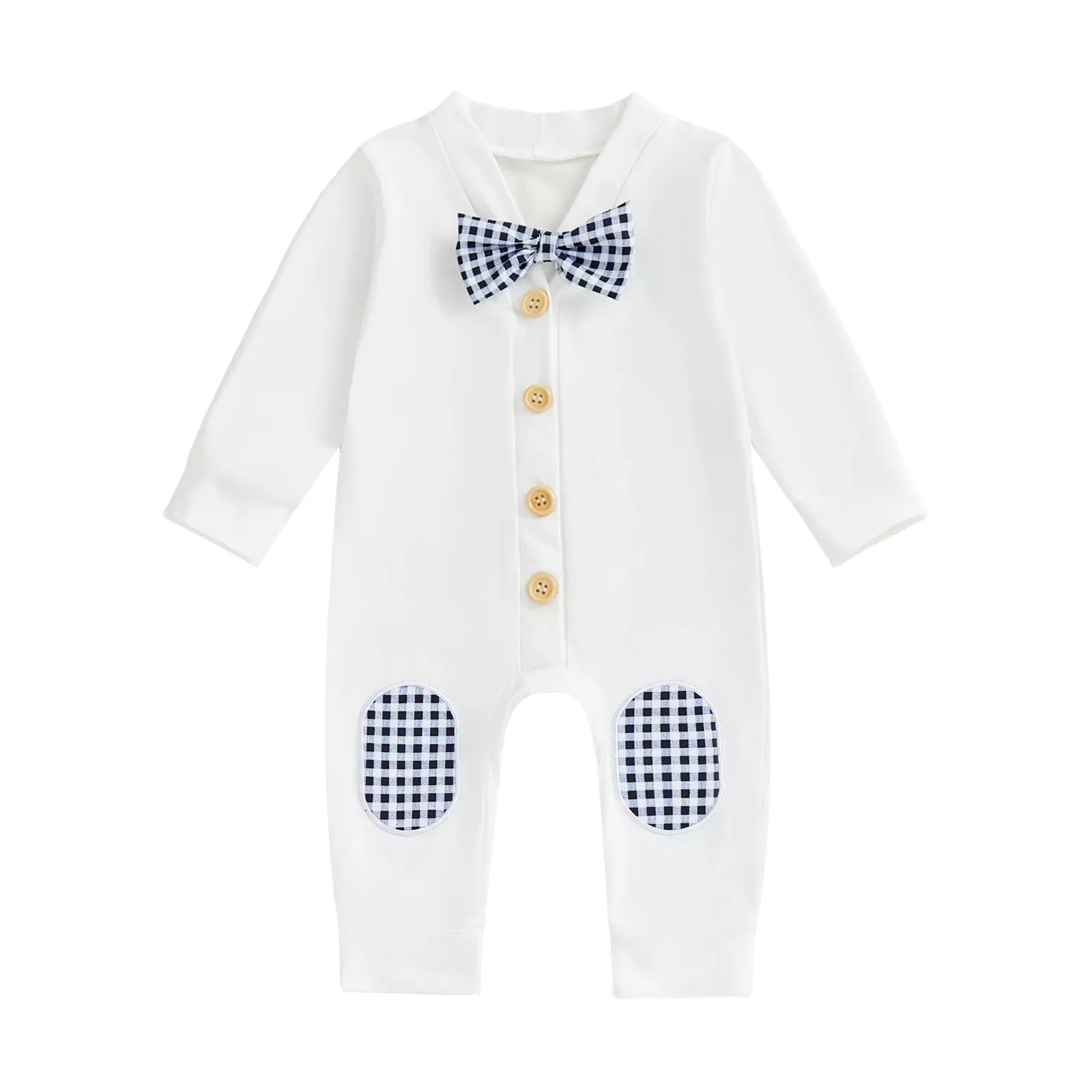 Dress your little gentleman in timeless charm with this Baby Boys Long Sleeve Plaid Jumpsuit with Bow Tie. Designed for comfort, style, and easy dressing, this adorable romper set is perfect for family gatherings, holidays, photoshoots, or just showing off your baby’s fashionable side. The classic plaid pattern and matching bow tie create a smart, dapper look that’s simply irresistible.