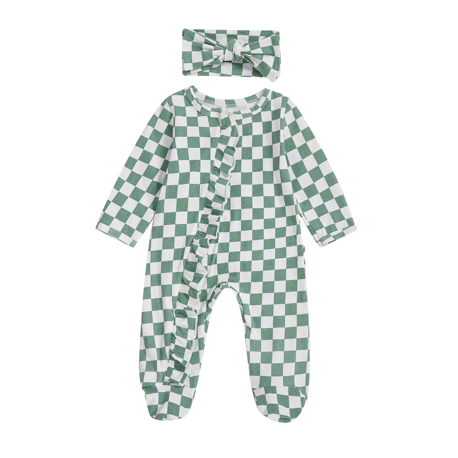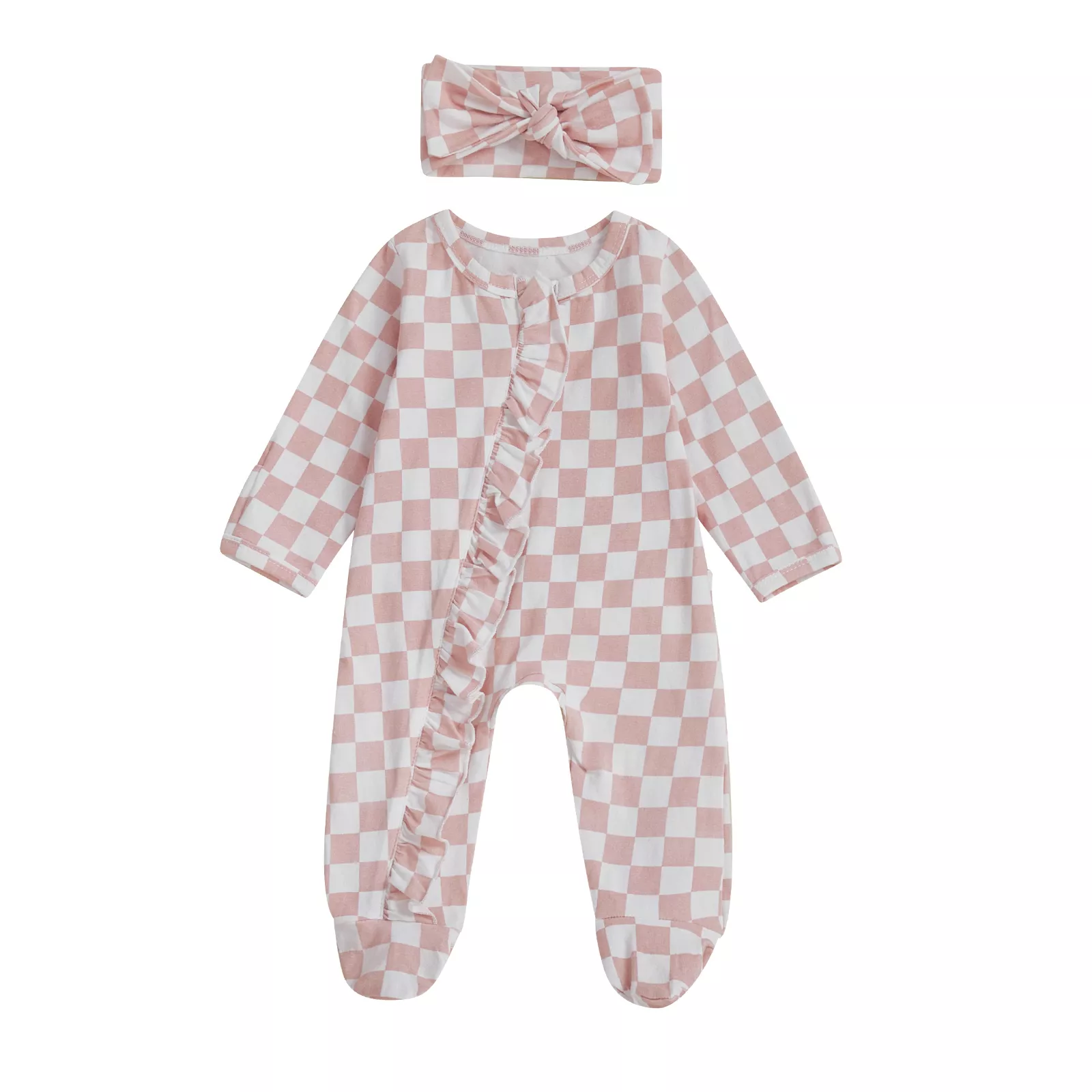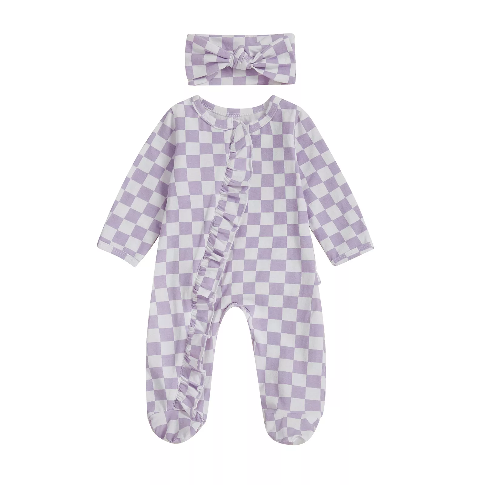 Dress your baby girl in cozy, picture-perfect style with this charming 2-piece fall footies bodysuit and headband set. Designed for newborns and infants up to 3 months, this romper combines warmth, softness, and irresistible cuteness. The trendy checkerboard pattern and delicate ruffle trim add a touch of playful fashion, while the easy zip-front closure makes dressing and diaper changes quick and stress-free.