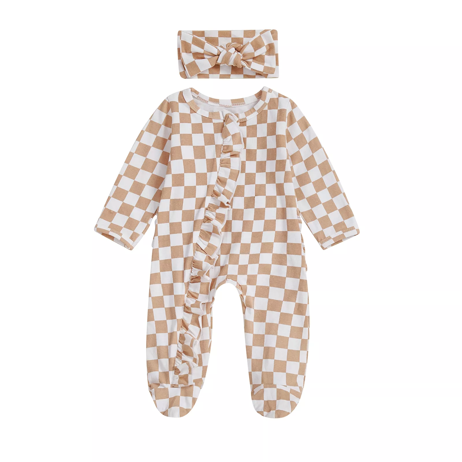 Baby Girl Checkerboard Ruffle Trim Fall Romper & Headband Set