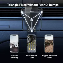 What sets this car phone holder apart from the rest is its intelligent design and premium materials. Crafted with aerial-grade aluminum alloy, it is both lightweight and durable. The gravity traction system ensures effortless placement and removal of your device. Thanks to the golden triangle support structure, your phone stays perfectly stable, even during sudden braking or on bumpy roads.
