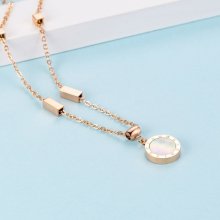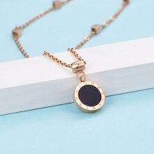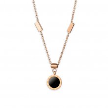 The rose gold necklace is made of stainless steel. Type of chain: a cable with geometric forms. Length: 18 in + 2 in. The pendant’s outer circle is enchased with Roman numerals. The inner circle is smooth and black.