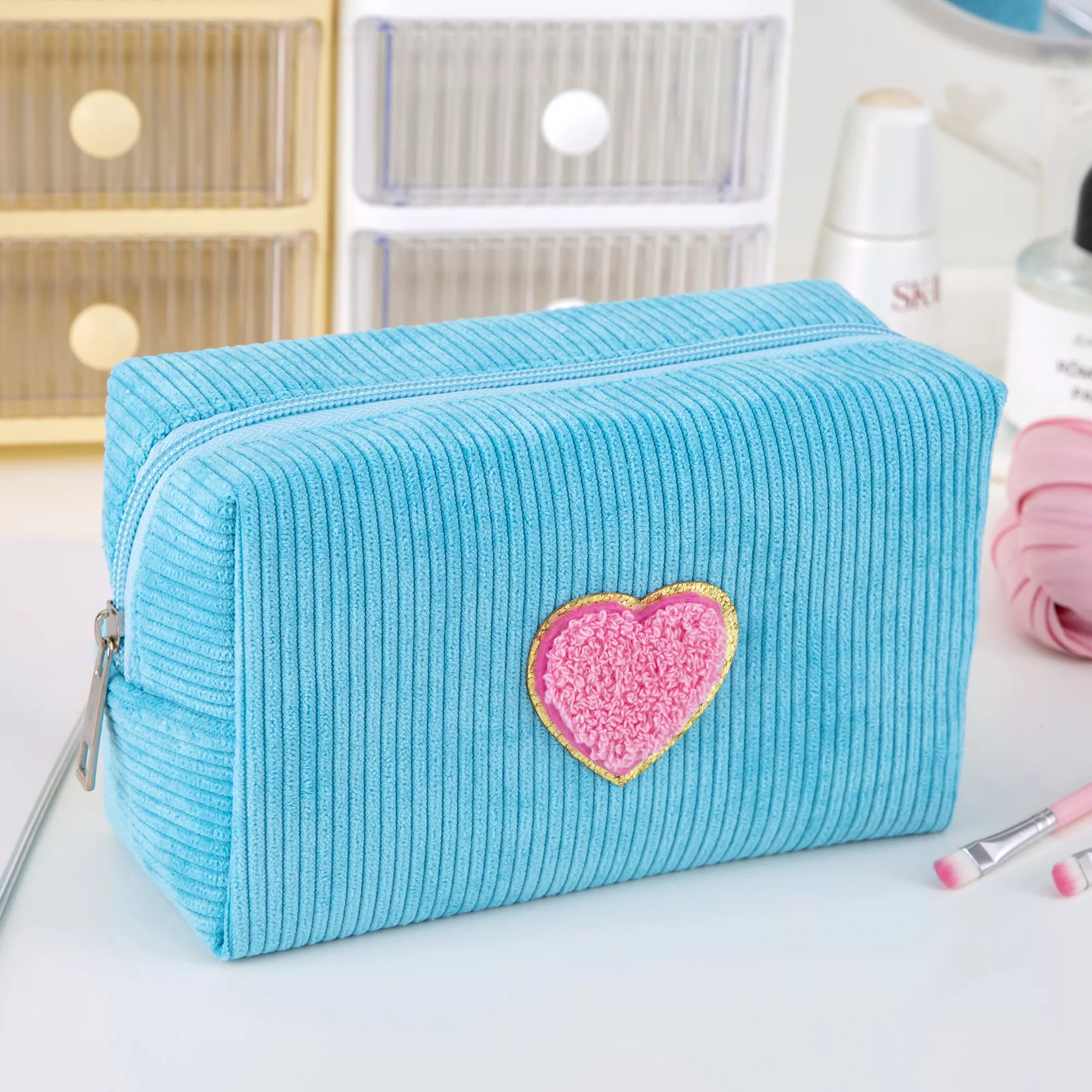 Corduroy Makeup Pouch with Heart Patch – Cute Travel Cosmetic Bag Organizer