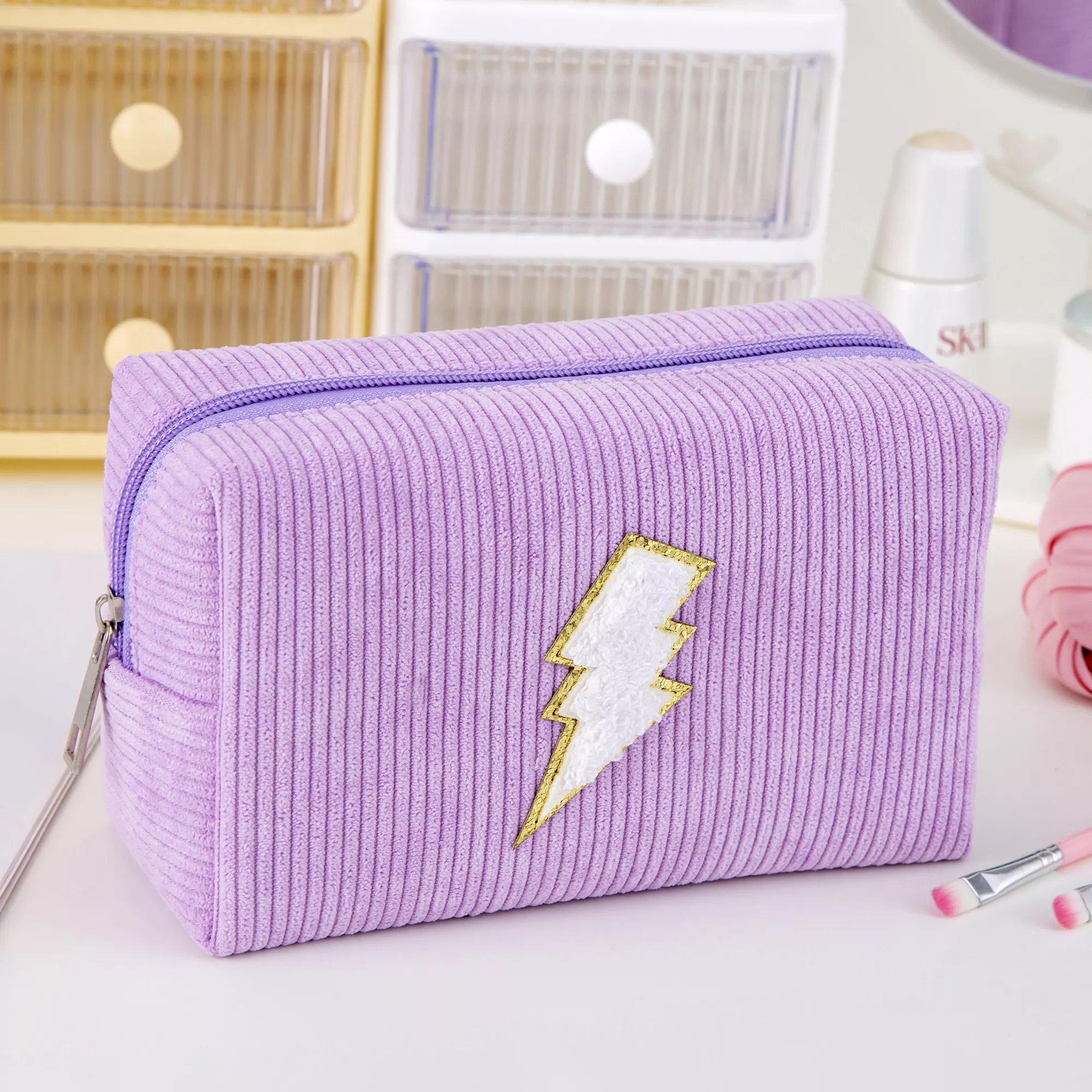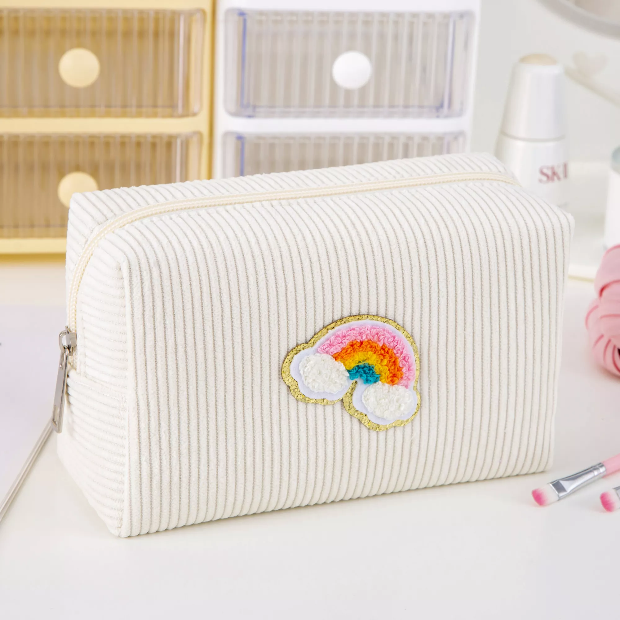 Upgrade from boring makeup bags to this delightfully charming organizer that makes accessing your products a joy. Notice how the soft corduroy exterior feels luxurious in your hands while protecting your cosmetics. The perfect blend of function and cuteness – treat yourself to this adorable pouch that keeps your essentials safe and stylish!