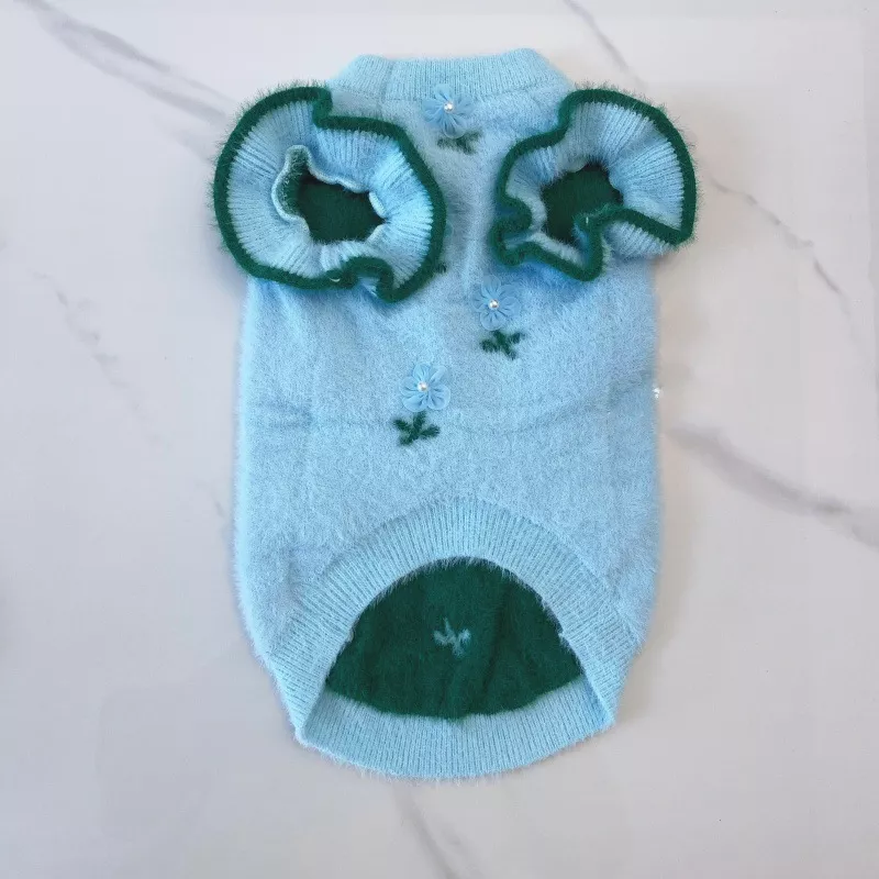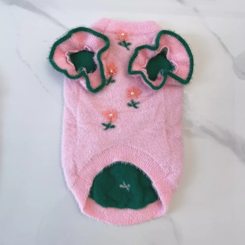This adorable sweater features a sweet solid-color knit accented with lovely flower details and cute fly-style sleeves, giving your pet a delightful, eye-catching look. The breathable yet insulating wool fabric helps maintain body heat during colder months, making it ideal for autumn breezes and frosty winter days. Its slip-on vest design ensures easy dressing, even for pets who dislike complicated clothing.