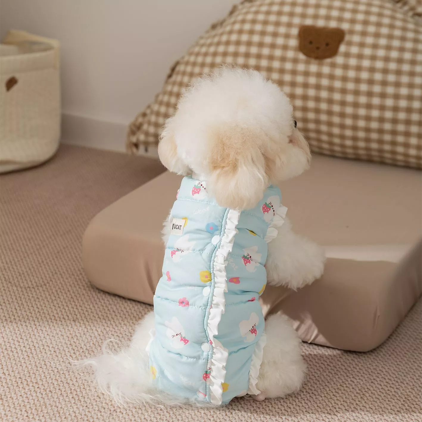 This jumpsuit is ideal for winter, when temperatures begin to drop and your little companion needs extra warmth. With a plush, lightweight feel, it’s perfect for daily wear around the house. The solid-color design paired with cute lace details gives your pet a sweet, cartoon-like look that’s sure to bring smiles. The four-leg structure provides full-body coverage without restricting movement, making it comfortable for active pups and playful cats alike.