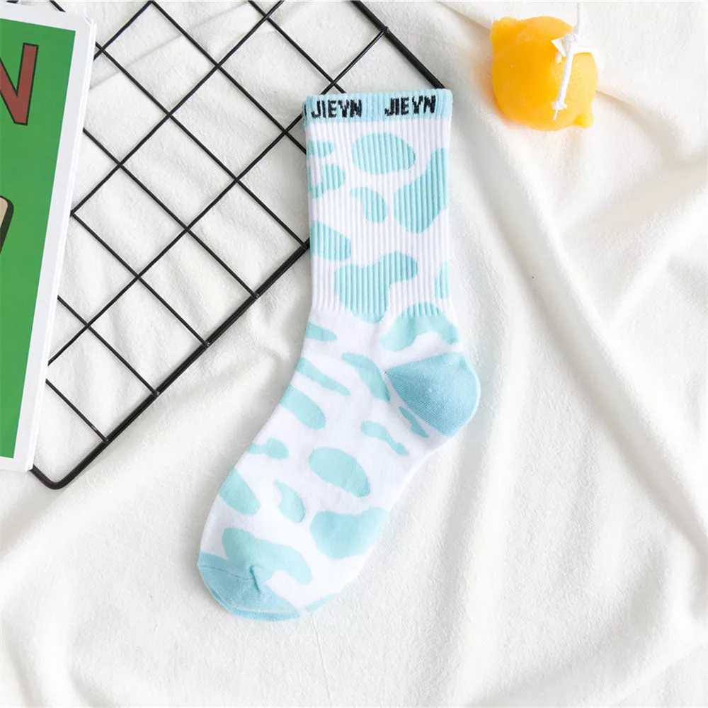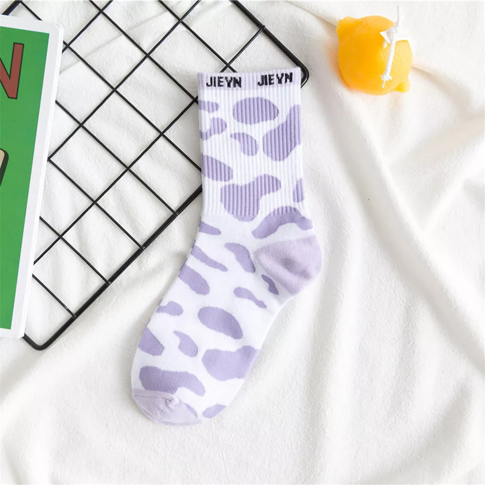 Step into the season with these charming Harajuku-inspired cow print summer socks, designed to bring a splash of fun and freshness to your everyday outfits. Featuring soft pastel tones in pink, blue, and purple, these socks blend adorable cartoon style with the cozy feel you love. Made with a breathable mix of cotton, polyester, spandex, and nylon, they offer a smooth knit finish and a comfortable middle-tube height that’s perfect for daily wear.