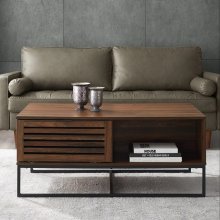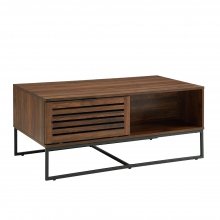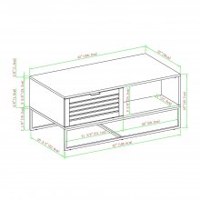 Designed with meticulous attention to detail, this coffee table features two drop-down slat doors that seamlessly conceal two fixed shelves, offering ample storage space for your essentials. The open storage compartments, adorned with contemporary metal handles, provide easy access and display options. The mixed material design, combining warp-resistant MDF, durable laminate, and powder-coated steel, ensures longevity and resilience.
