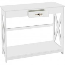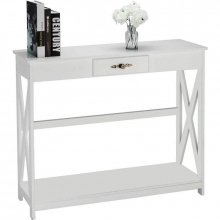 Our console table is more than just a pretty face. It features a spacious tabletop, a convenient middle drawer, and a lower shelf, offering ample storage and display options. Whether showcasing your favorite decor or keeping essentials at hand, this table has you covered. The vintage handle on the drawer adds a nostalgic touch, while the white finish complements any interior palette.