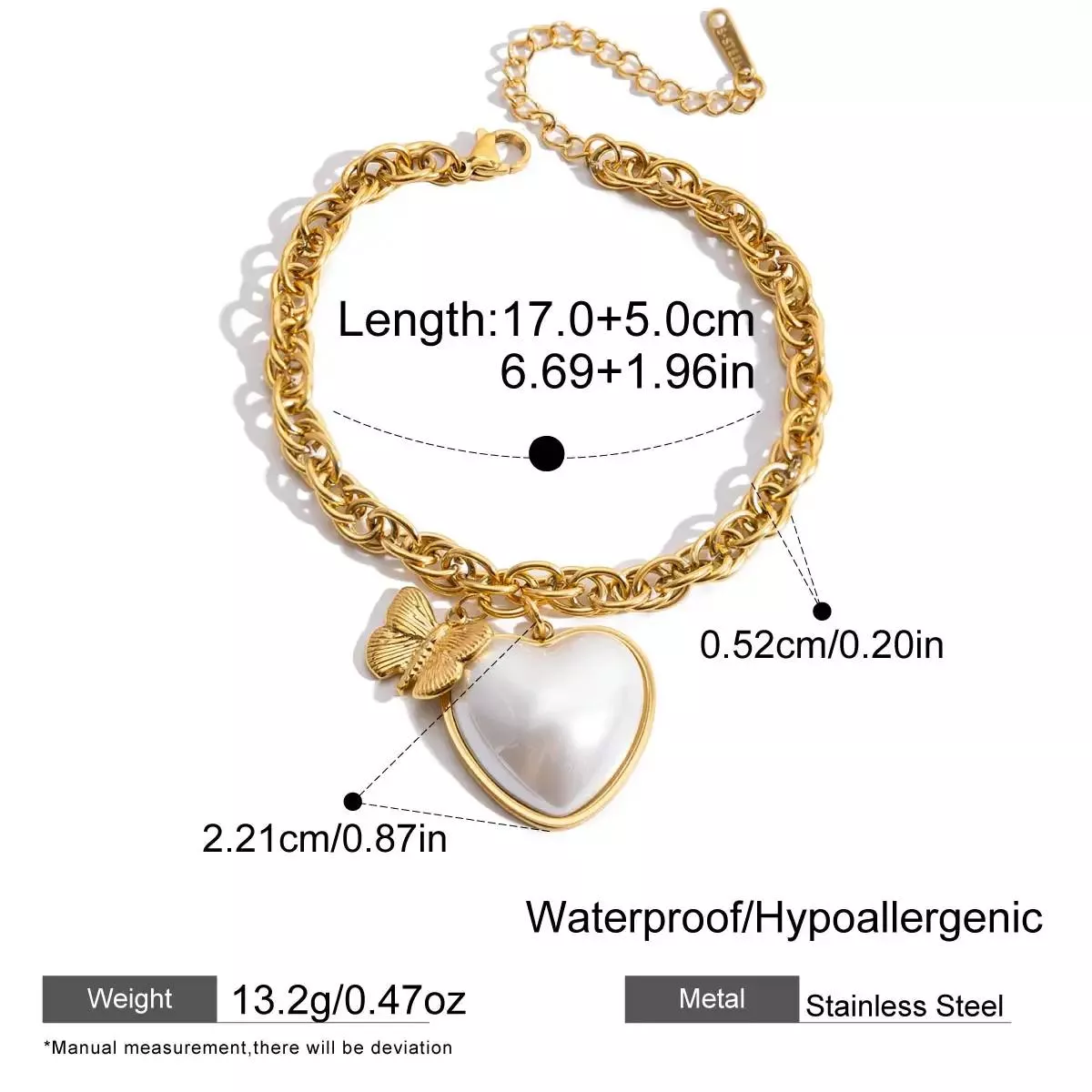 This bracelet is a true testament to the art of jewelry-making. The heart-shaped imitation pearl symbolizes love and affection, while the butterfly design represents transformation and freedom. Together, they create a piece that not only enhances your look but also carries meaningful symbolism. Made from high-quality stainless steel, this bracelet is lightweight yet strong, ensuring both comfort and durability with every wear.