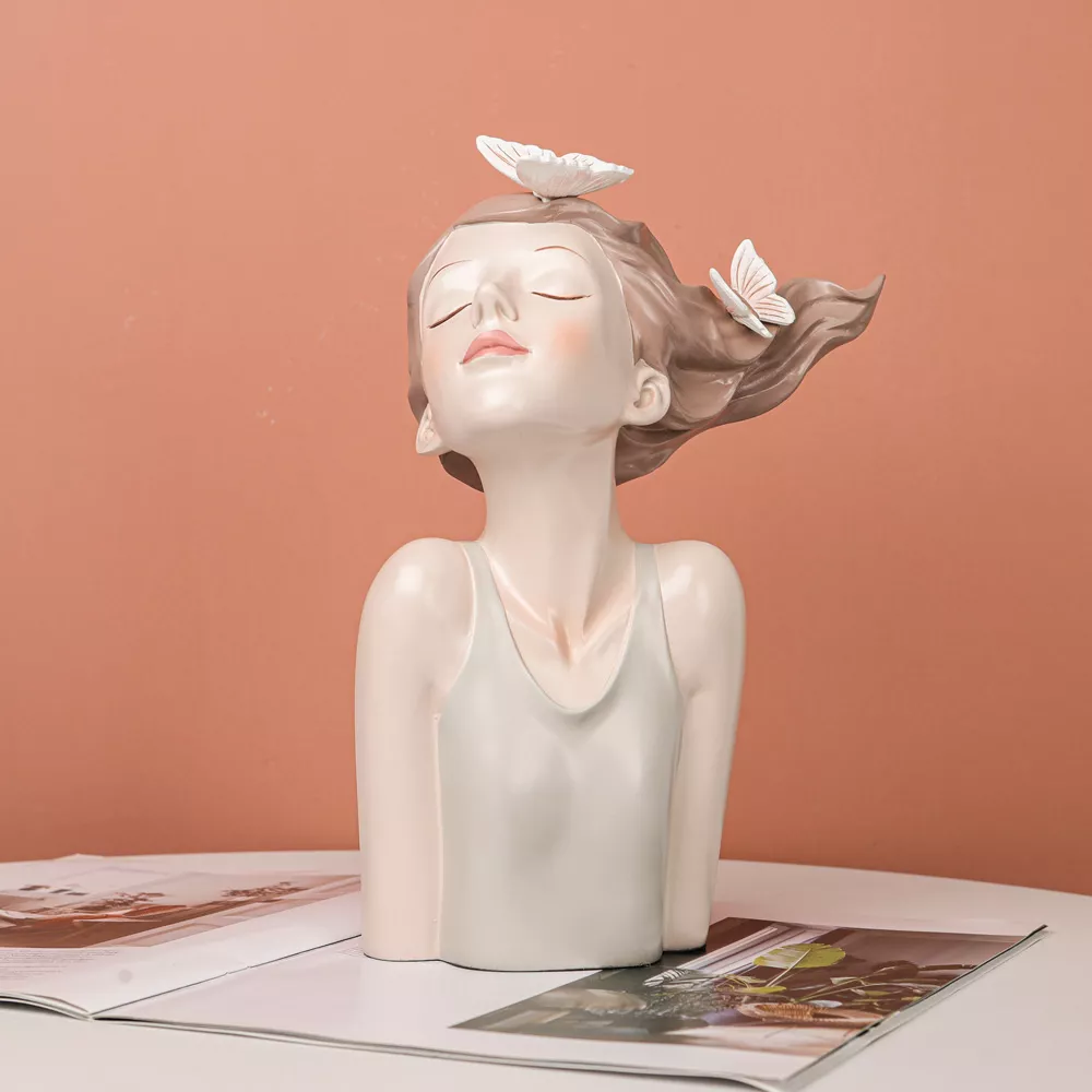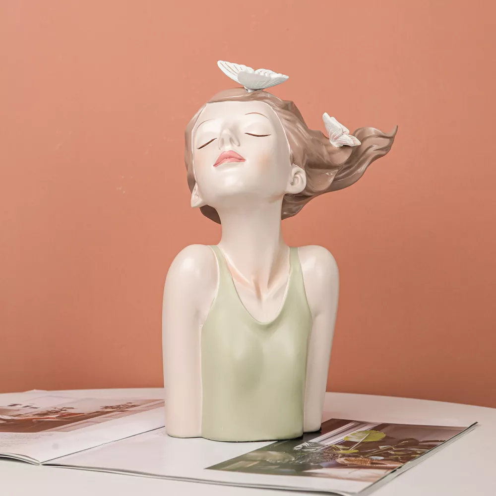 Standing at approximately 10.2 inches tall (7×3.9×10.2in), this elegant resin bust showcases a young girl adorned with delicate butterflies resting gracefully on her hair — a gentle symbol of transformation, freedom, and hope. Available in three refined hues — green, grey, and light yellow — its low-saturation color palette brings a soothing, modern aesthetic that blends beautifully with contemporary decor themes.