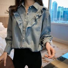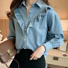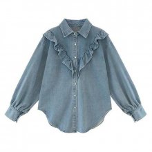 Step into the season with a garment that effortlessly blends classic charm with modern flair – our Elegant Ruffle Denim Blouse. Designed with a sophisticated woman in mind, this blouse is a perfect match for those who appreciate a blend of casual comfort and sartorial elegance. From the lapel’s refined ruffles to the comfortably loose fit, this blouse is crafted to make a statement while keeping you at ease, no matter where your day takes you.