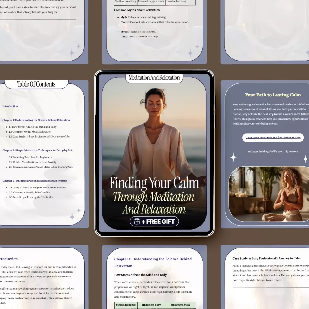 Finding moments of peace in a busy world can feel impossible—but it doesn’t have to be. Finding Your Calm Through Meditation and Relaxation is a thoughtfully designed digital guide that helps you slow down, breathe deeper, and reconnect with yourself using simple, science-backed techniques. Whether you’re completely new or returning to a practice that slipped away, this guide shows you how meditation and relaxation can fit naturally into real life, even on your busiest days.