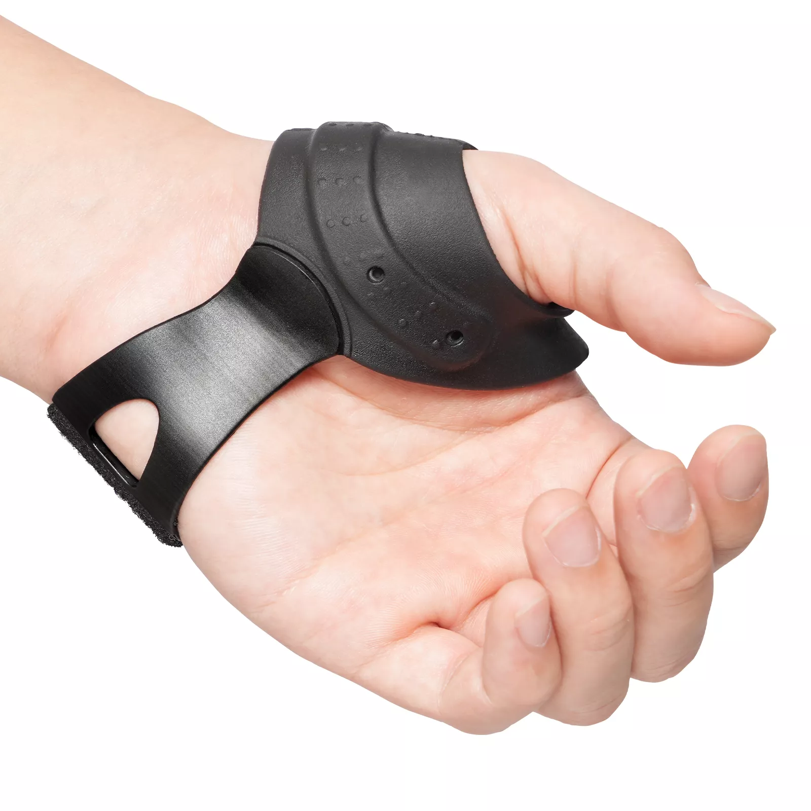 This thumb brace is crafted from durable NBR rubber that stays flexible while resisting tears, cracks, and deformation. Its soft, elastic feel minimizes friction between the thumb and index finger, ensuring all-day comfort. The full palmar bar made from sturdy TPU plastic helps prevent CMC hyperextension for enhanced joint protection. A smooth silicone leather wrist strap adds a stable, non-slip hold, while a reinforced metal insert wraps securely around the base of the thumb to deliver dependable support without restricting natural hand movement.