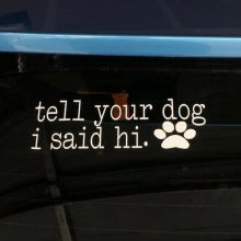 Introducing our ‘Friendly Greeting Dog Lover Vinyl Decal’ – the perfect way to share your love for canines with the world! Designed for true dog enthusiasts, this decal is more than just a decoration; it’s a friendly wave to all the furry friends you pass by. With a fun and heartfelt message that reads “Tell Your Dog I Said Hi,” this decal is sure to bring smiles and tail wags wherever you go.