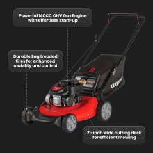 Transform your lawn care routine with our high-powered 21-inch Gas Push Lawn Mower. Boasting a robust 140cc OHV engine, this mower simplifies your yard work with its reliable recoil start and auto choke system, eliminating the hassle of priming and choke adjustments. Perfect for small to medium-sized yards (1/8 to 1/4 acre), it ensures a flawless cut with fewer passes, saving you time and energy.