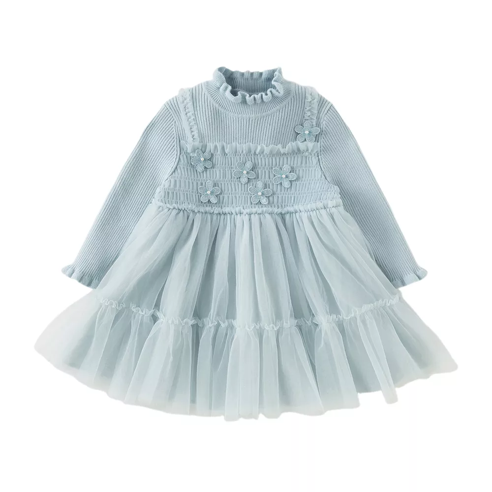 This knee-length A-line dress features a classic crew neck and full sleeves, keeping your child snug during cold weather. The delicate lace overlay and mesh detailing add a dreamy, feminine touch, while the sweet floral accents make it stand out from ordinary kids’ dresses. Whether layered with tights and boots for outdoor wear or worn on its own indoors, this dress brings a blend of cuteness and practicality.