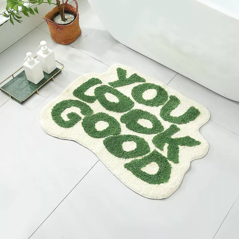 Brighten up your bathroom with the playful and chic “You Look Good” bath mat! Designed to bring comfort and style, this rug adds a touch of personality to your bathroom decor. Featuring a vibrant green color with a fun message, it’s not only an eye-catching addition to your space but also provides an incredibly soft and cozy feel for your feet. Say goodbye to cold floors and hello to comfort and style every time you step out of the shower!