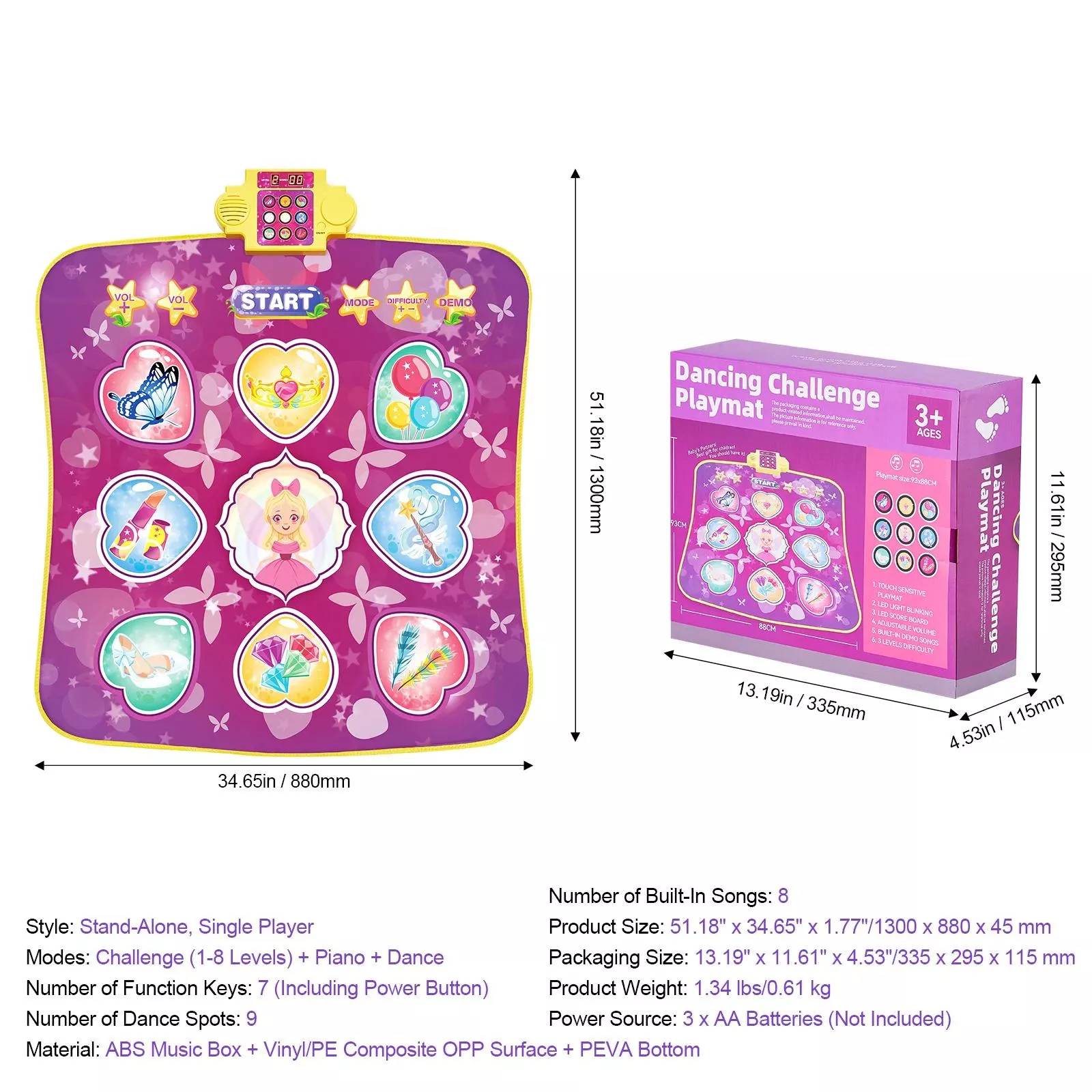 Made from high-quality vinyl with a PE-composite OPP surface, this dance pad is built to last. The non-slip PEVA bottom ensures stability while dancing, so kids can move freely without worry. Lightweight and foldable, it’s perfect for storage or taking along on trips. Powered by 3 AA batteries (not included), it can go anywhere, from the living room to the backyard, letting children dance anytime inspiration strikes.