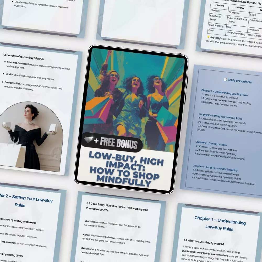 - Chapter 1 – Understanding Low-Buy Rules: Learn the foundations of the low-buy approach, how it differs from no-buy, and why it’s a sustainable lifestyle choice.