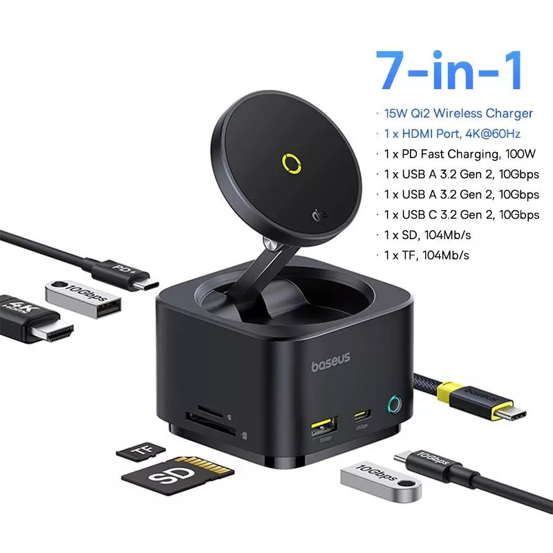 - 7-in-1 Expansion – USB-C, USB-A, HDMI, SD, TF slots, and wireless charging in one hub