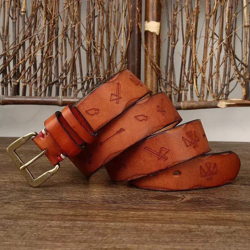 Unlike ordinary belts that wear out over time, this belt is crafted from first-layer cowhide leather, giving it exceptional durability and a rich texture that improves with age. The solid copper pin buckle provides a secure fit and adds a vintage touch that complements the belt’s bold design. Every belt undergoes a special treatment process—washed, carved, and embossed—to achieve a distinctive look that speaks of quality and individuality.