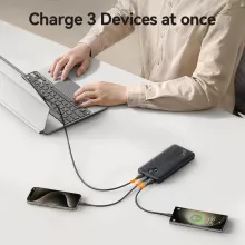 With one USB-C input/output port and two USB-A output ports, this power bank can charge up to three devices at once. Whether it’s your iPhone, AirPods, or iPad, enjoy unparalleled convenience and efficiency. The universal compatibility ensures it works seamlessly with most of your favorite tech gadgets.