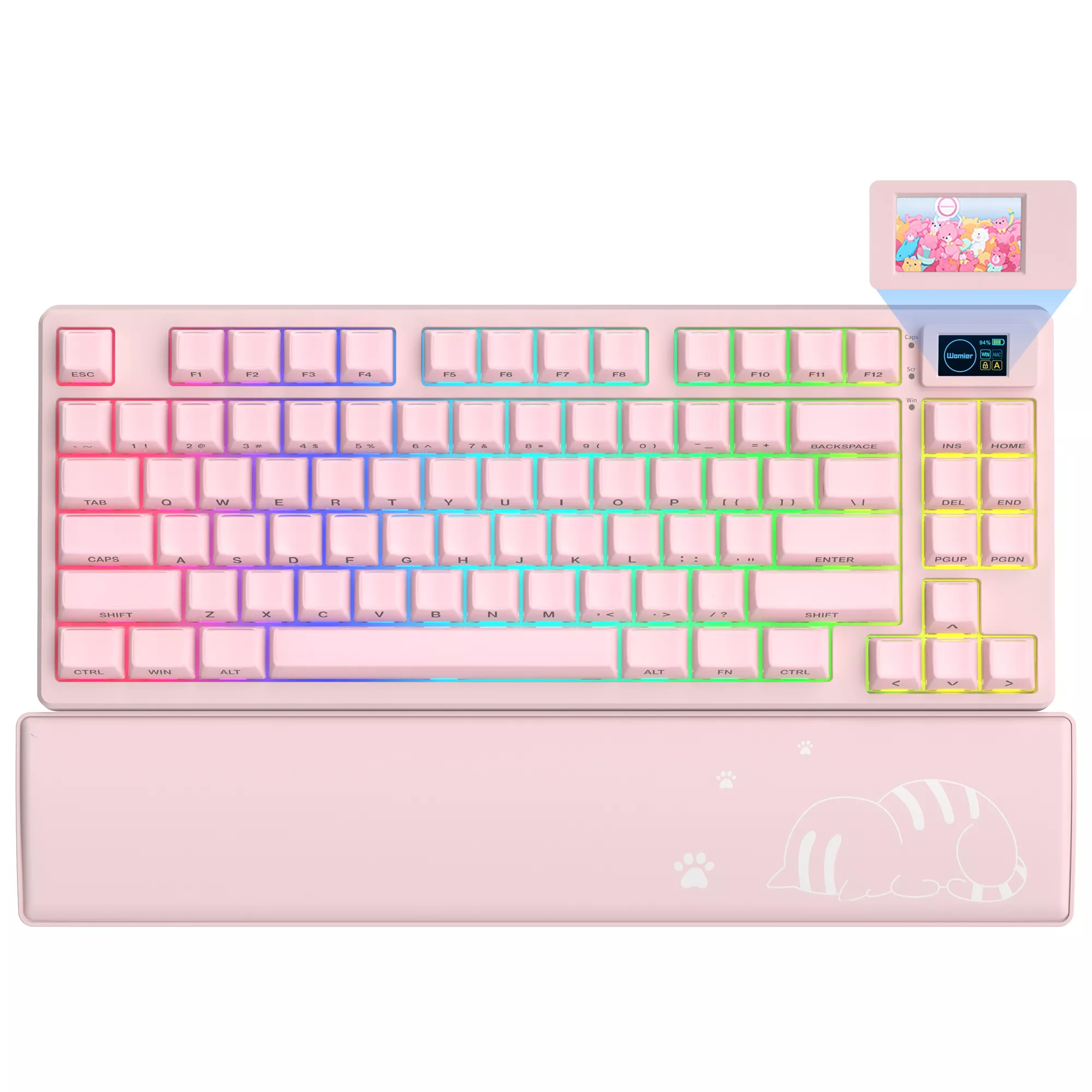 At the heart of this keyboard is a colorful multimedia OLED display that shows your time, connection mode, battery level, and even custom GIFs—adding both convenience and fun to your workflow. Its 11° angled screen sits perfectly within your natural line of sight. The included themed wrist rest and matching mouse pad create a cohesive look and provide comfortable support during long sessions.