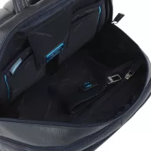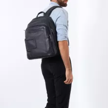 This backpack stands out as more than just a bag. Its sleek blue leather finish adds a touch of elegance to any outfit, while its functionality meets the demands of a fast-paced lifestyle. The Piquadro logo and contemporary design elements ensure it pairs effortlessly with both casual and professional attire.
