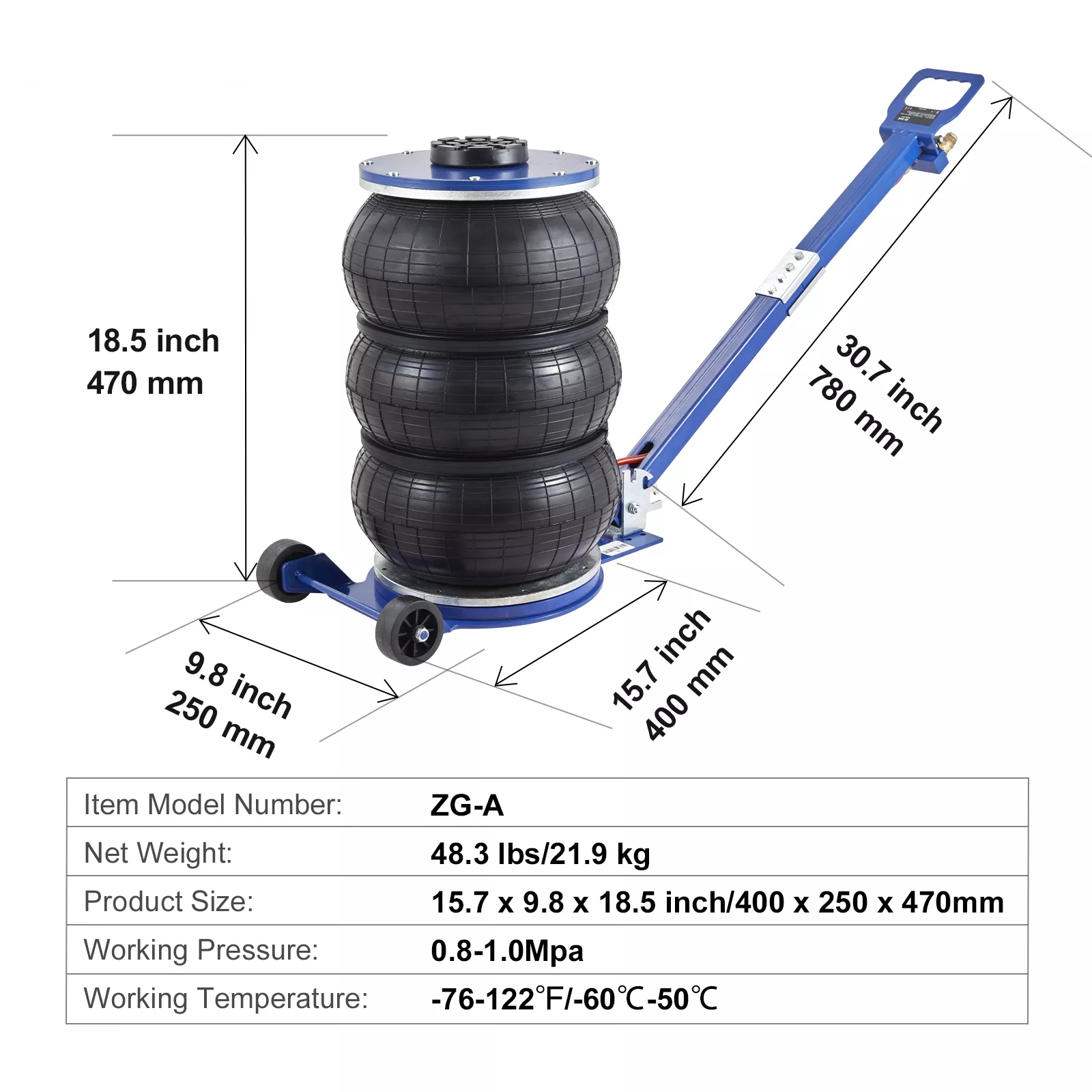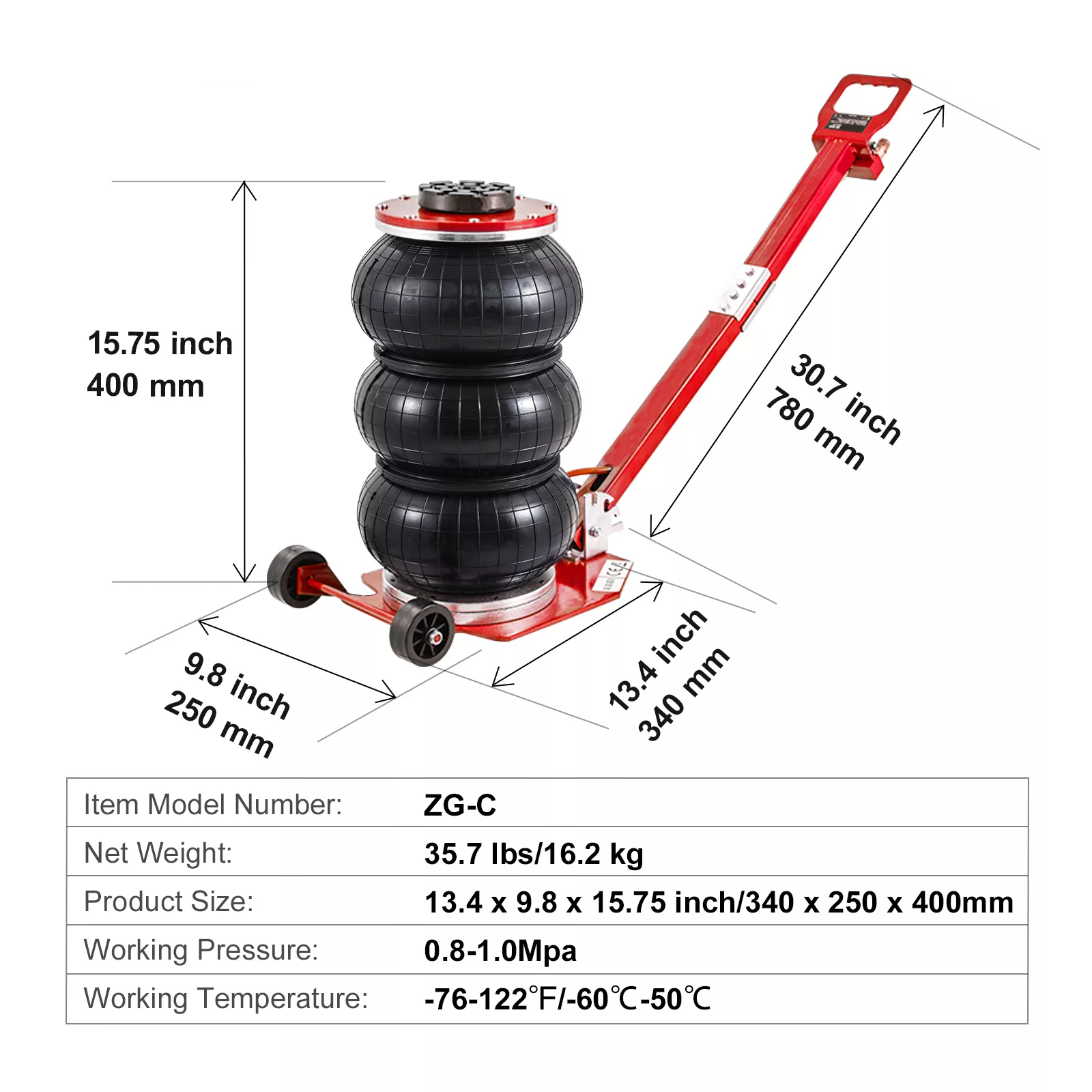This air jack is a versatile companion for both professional mechanics and DIY car enthusiasts. It’s perfect for tire changes, brake inspections, suspension work, or undercarriage access. With a generous lifting range of 5.5 to 17.7 inches, it accommodates different vehicle heights with ease, ensuring you can tackle a variety of maintenance and repair jobs without hassle.