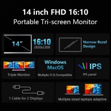 Elevate your work and play with our Tri-Screen Portable Monitor. Specifically designed for those who thrive on multitasking and efficiency, this innovative product extends your laptop’s display with ease. Its 14-inch, 16:10 aspect ratio, and 1920×1200 FHD resolution provide a stunning and seamless visual experience. Ideal for professionals, gamers, and tech enthusiasts, this portable monitor is a game-changer for enhancing productivity and entertainment on the go.