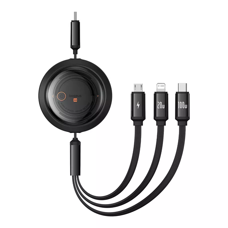 Retractable 100W 3-in-1 Fast Charging Cable with Type-C, Lightning & Micro USB