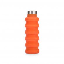 This foldable water bottle comes in a stylish orange color. Size when folded: 5.5” in height, with a 2.8” diameter. Full size: 9.5” in height. Main materials: food-grade silicone, BPA free, food grade PP. Cold and heat resistant.