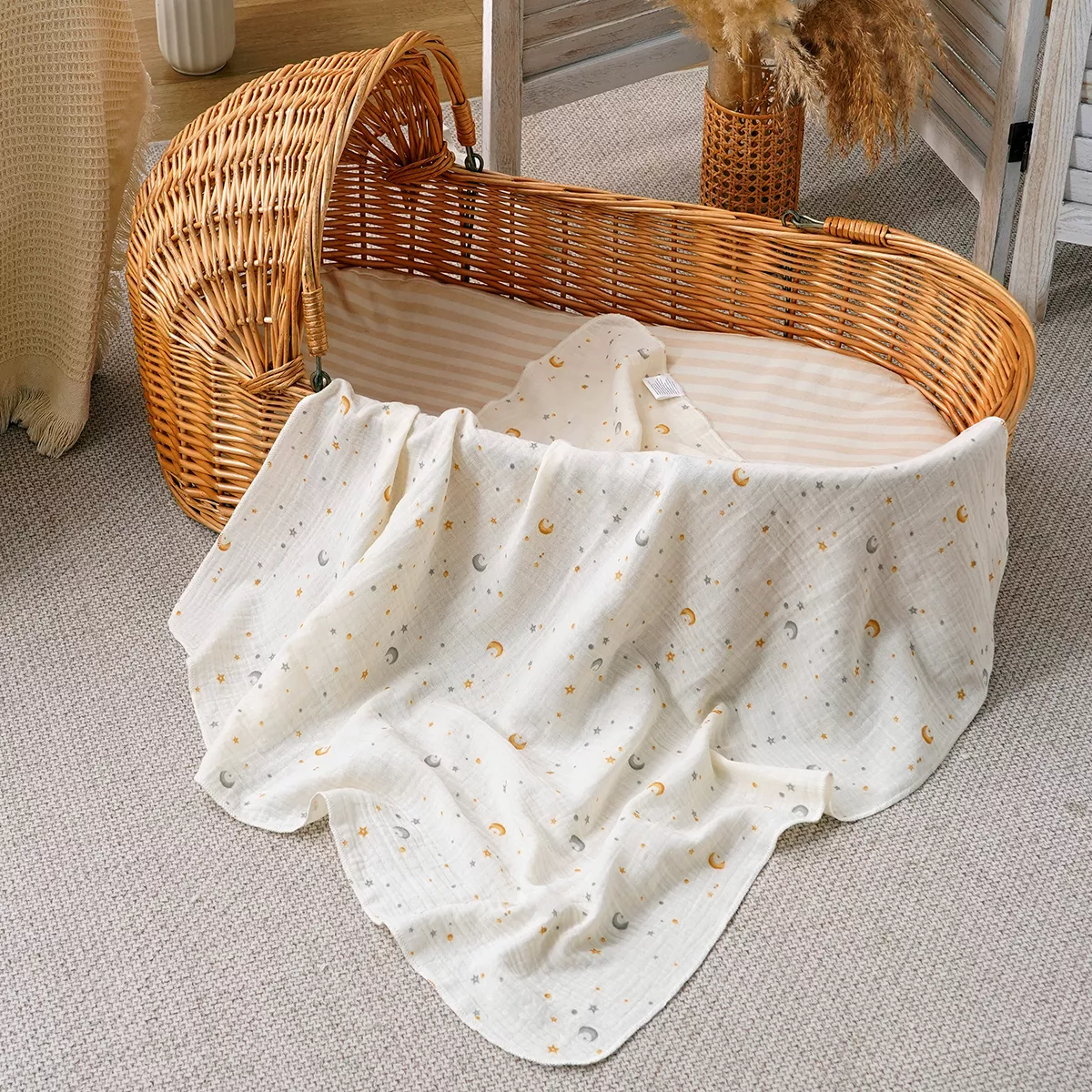 This muslin blanket is more than just a swaddle – it’s a multi-purpose essential for your baby’s daily comfort. Its breathable fabric helps regulate temperature, preventing overheating while still keeping your little one warm and snug. You can use it as a swaddle wrap, nursing cover, stroller shade, or bath towel after a warm bath. The soft, airy texture makes it ideal for delicate newborn skin, ensuring your baby feels loved and secure at all times.