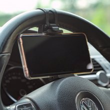 A silicone strap clips atop any car steering wheel while a retractable plastic spring-holder holds your device in place.