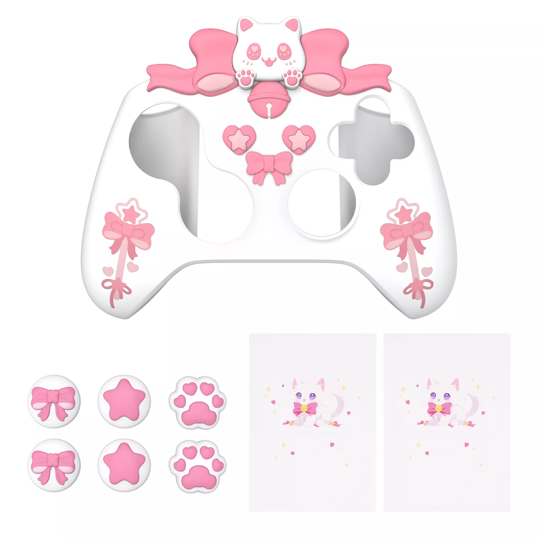 Bring a touch of cuteness to your gaming setup with the Sweetheart Kitty Silicone Cover for Xbox Series X & S controllers. Designed with playful cat-inspired elements, star wands on the grips, heart-shaped buttons, and a jingling cat above the controller logo, this cover adds a delightful, whimsical aesthetic while maintaining full functionality. The themed back stickers complete the adorable look, making your controller truly stand out.