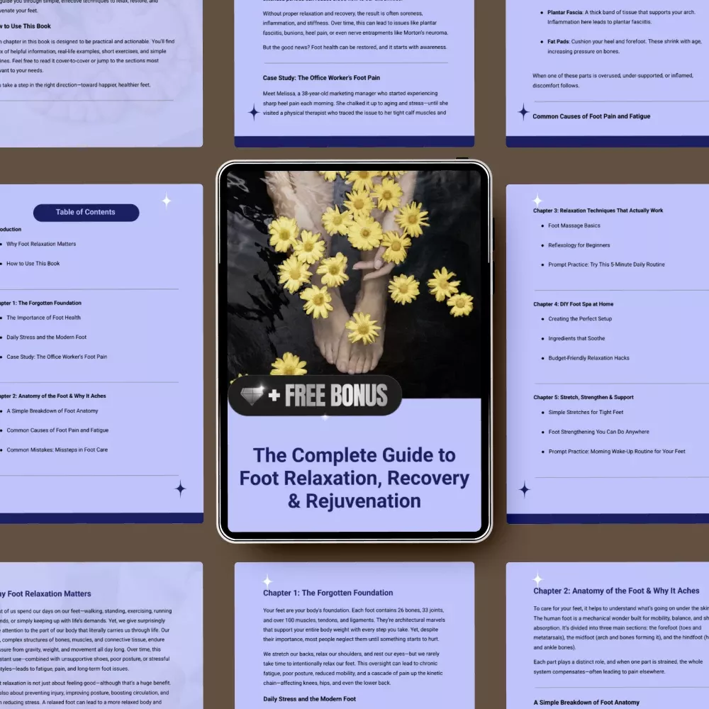 Your feet carry you through every single day, yet they’re often the most neglected part of your body. The Complete Guide to Foot Relaxation, Recovery & Rejuvenation is a practical, easy-to-follow digital ebook designed to help you release tension, reduce daily discomfort, and reconnect with true foot relaxation from the comfort of your own home. Whether you’re standing all day, sitting at a desk, or simply craving better self-care routines, this guide meets you exactly where you are.