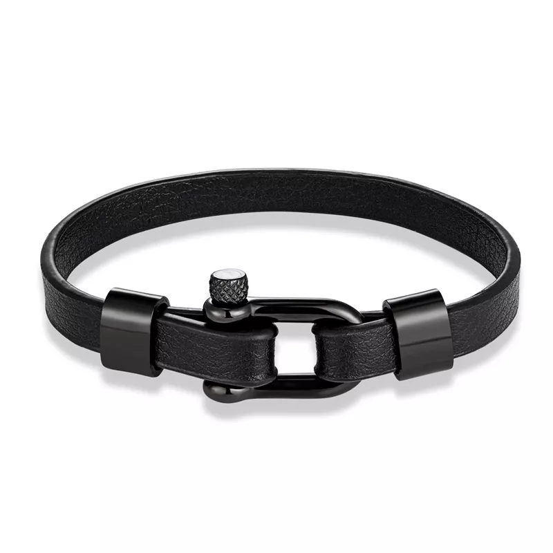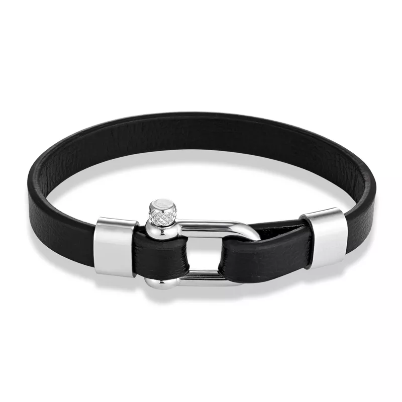 This bracelet features a sturdy U-shape shackle buckle that locks in securely while giving off a cool, industrial vibe. The rich black leather band wraps comfortably around your wrist, while the polished stainless steel adds a modern shine. Available in three lengths—7.5 inches, 8.3 inches, and 9 inches—it’s designed to suit different wrist sizes with a precise fit. The combination of materials ensures it remains resistant to tarnish, rust, and wear, making it a long-lasting addition to your accessory collection.