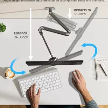 Experience ultimate versatility with a mount that’s foldable, adjustable, and extendable. Equipped with six hinge bearings and a ball-type universal axis, it offers 360°/180° rotation and a height range adjustment of 7.9 inches. Extend your tablet up to 26.3 inches for close-up work or retract it to 5.5 inches for compact storage. The three-stage adjustable arm ensures the perfect viewing angle, whether you’re cooking, streaming, or working from home.