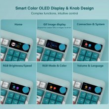 Our keyboard is more than just a tool; it’s an extension of your personal style and technical prowess. It boasts a versatile tri-mode connection, including Bluetooth, 2.4GHz wireless, and USB-C, ensuring seamless connectivity across all your devices. The hot-swappable switches and customizable RGB lighting aren’t just features; they’re invitations to tailor your typing to perfection. With a robust 3000mAh battery and an innovative OLED display that offers at-a-glance information, you’re equipped for endless sessions of gaming or intensive work.