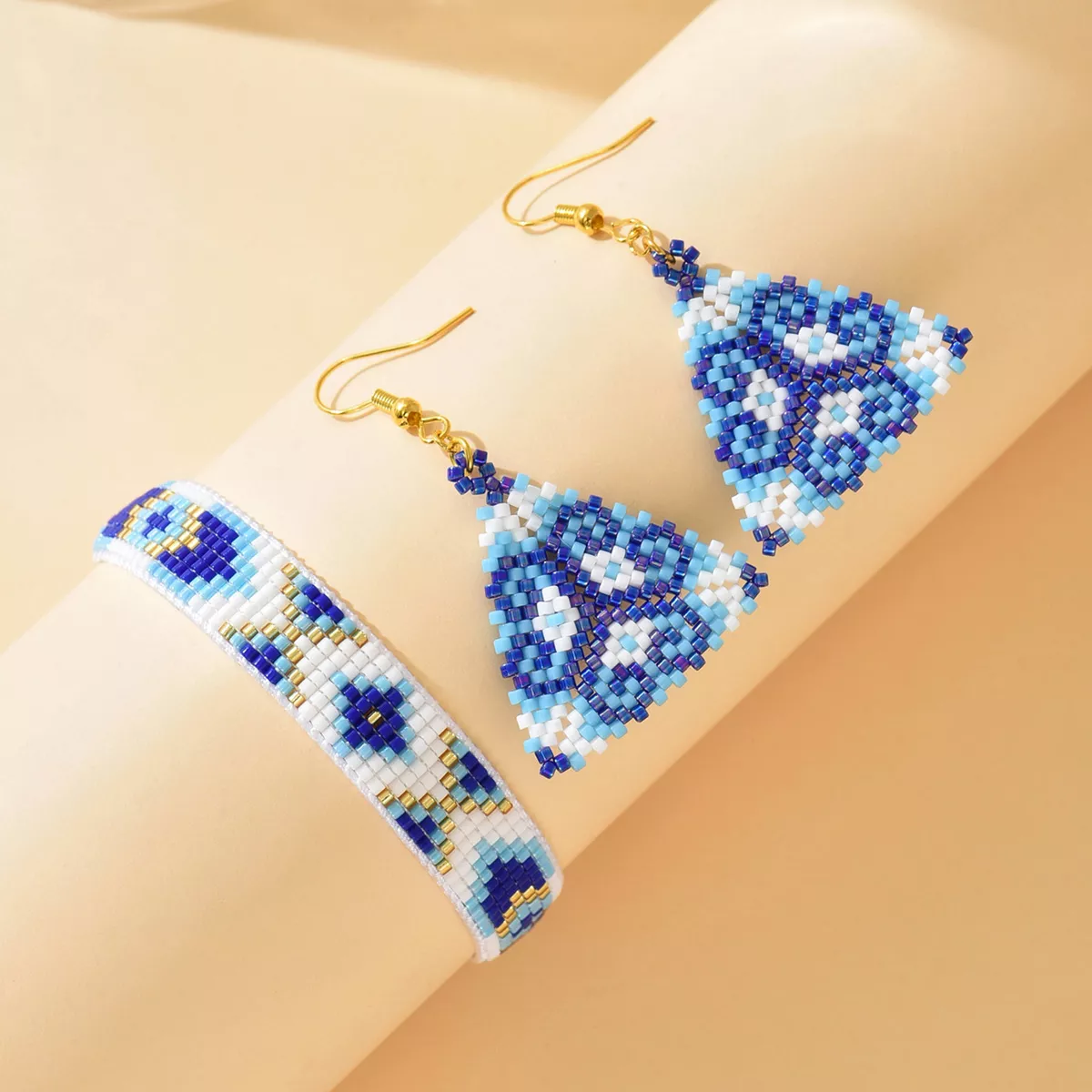 Let your style speak through color, pattern, and handmade artistry. This Miyuki beaded bracelet and earring set is ready to become your new favorite accessory. Bring home this creative fashion piece and enjoy the perfect blend of beauty, personality, and boho charm. Order now and express your free-spirited style with every wear.