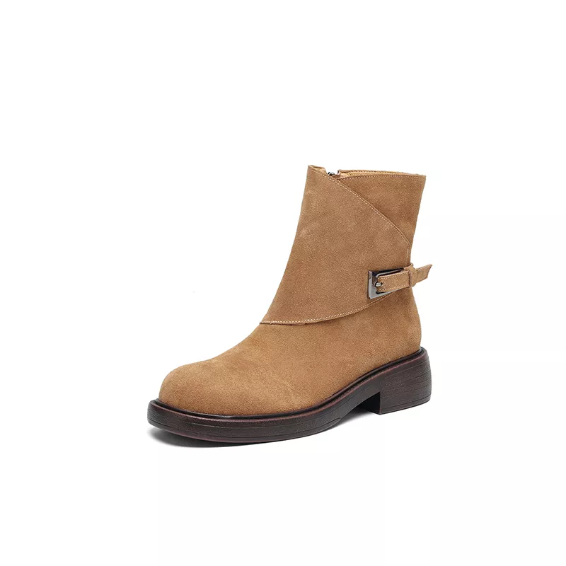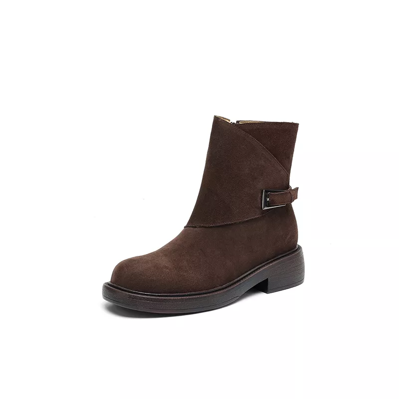 These boots are more than just footwear—they are a statement. The rich cow suede not only looks sophisticated but also provides a soft touch against the skin. The plush insole ensures every step feels cushioned, while the square heel supports long hours of wear without discomfort. Their ankle height is perfect for layering with different outfits, making them incredibly versatile for winter and early spring. What sets these boots apart is the seamless blend of style, warmth, and practicality, offering a fashionable look without sacrificing comfort.