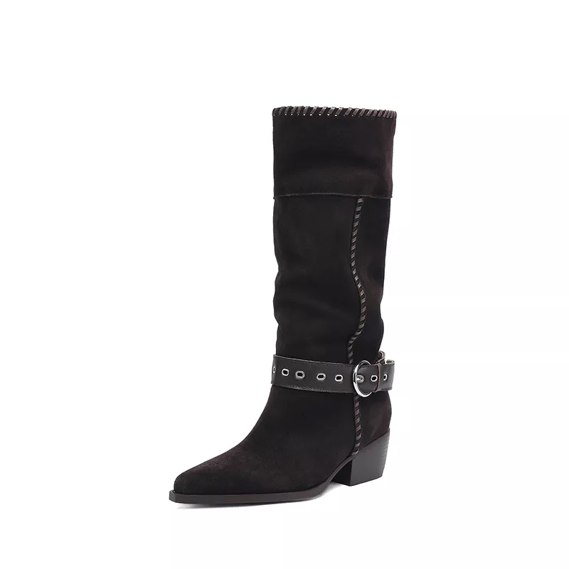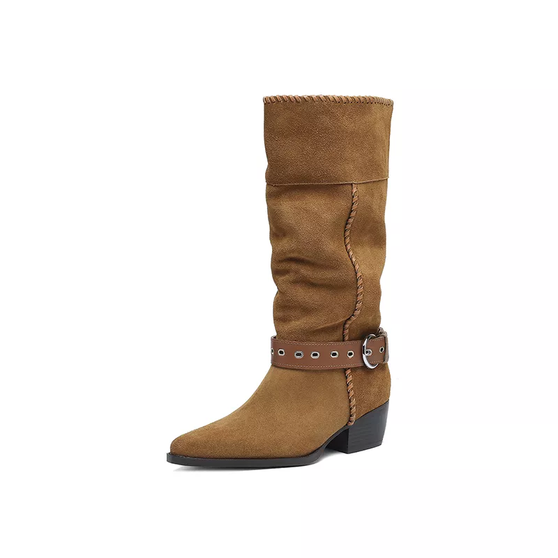 Bring timeless charm to your autumn wardrobe with these stunning mid-calf western boots. Crafted from premium cow suede, these boots combine a soft, velvety texture with a chic retro design. Featuring a sleek pointed toe and bold buckle strap, they add a touch of Western-inspired edge while keeping your look modern and versatile. Whether you’re dressing up for a night out or pairing them with jeans for a casual day, these boots are the perfect mix of style and comfort.