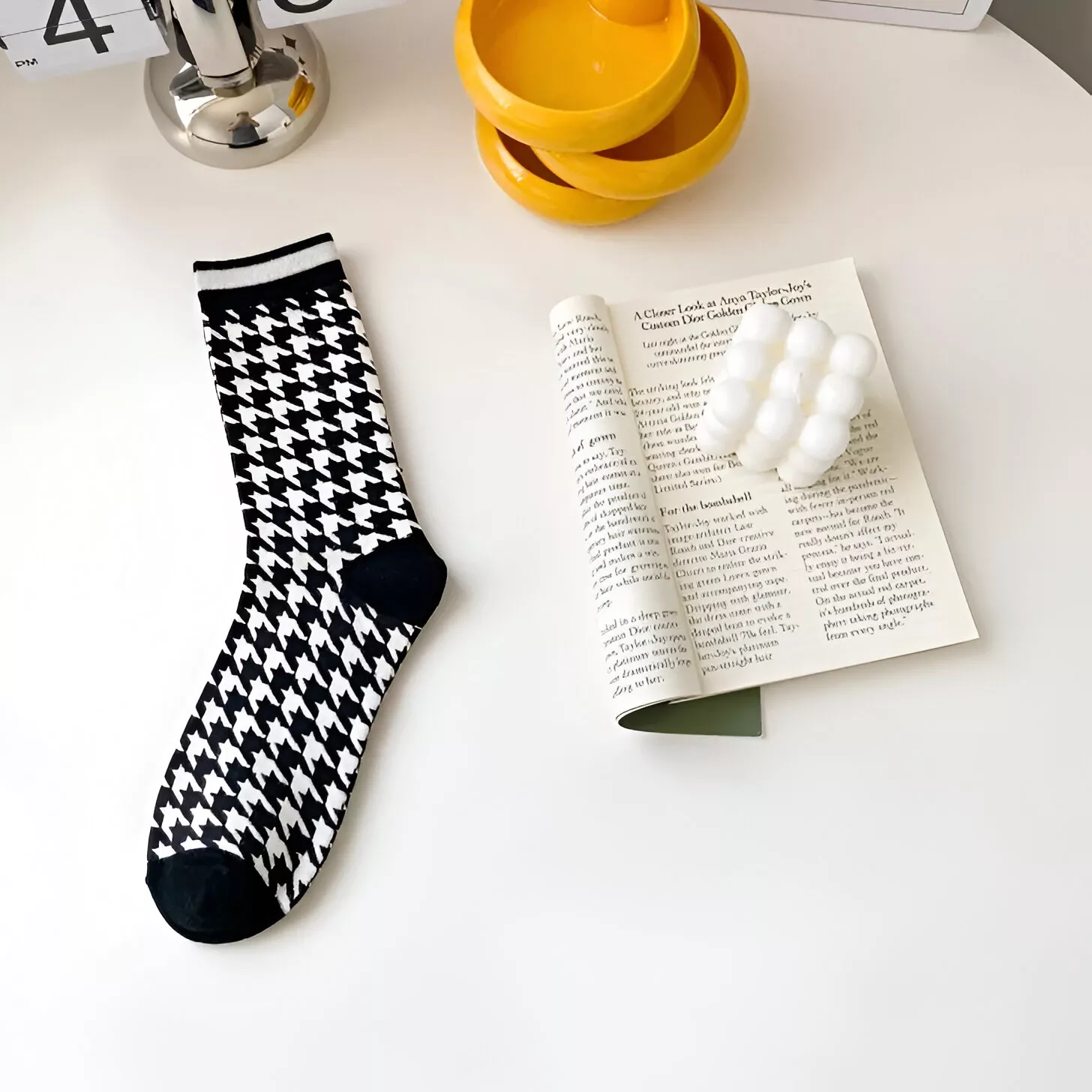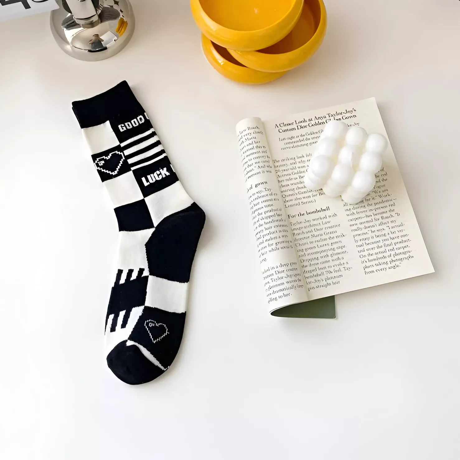 These socks combine a retro check pattern with subtle floral accents, creating a unique blend of classic and kawaii style. Their knit craftsmanship ensures durability, while the medium thickness keeps your feet warm in winter and comfortable in spring, summer, and fall. Designed in a free size that fits US 5–9, they gently stretch to give you a snug, non-slip fit every time you wear them.